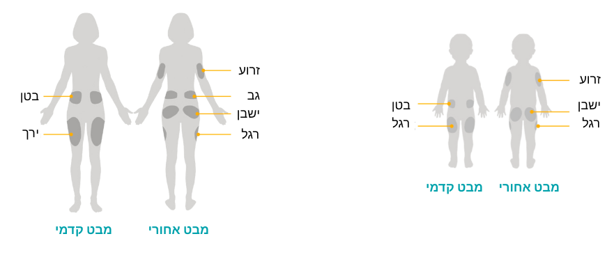 Omnipod מאושר לשימוש מגיל שנתיים ומעלה. להלן פירוק של המיקומים המומלצים עבור מבוגרים וילדים, שכן יש בין ההמלצות הבדלים קלים ואנחנו רוצים שתרגישו הכי טוב שאפשר!