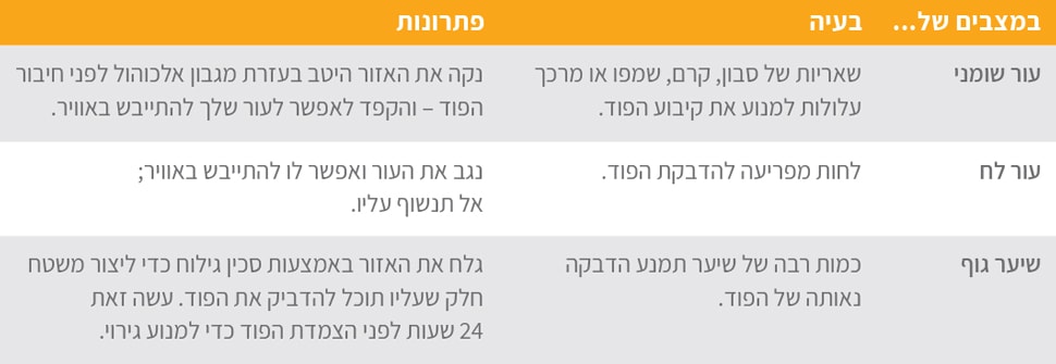 כדי לעזור לפוד להישאר מקובע, יש לשמור על סביבה קרירה כאשר העור יבש ולא מזיע. להלן מספר גורמים שיכולים למנוע מהפוד שלך להיצמד ביעילות וטיפים כיצד להתגבר עליהם: