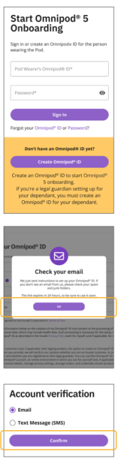 לאחר שההזמנה שלכם תעובד על ידי Insulet, תקבלו הודעת דוא"ל עם הכותרת "Complete Your Omnipod® 5 Onboarding Now" (השלימו את תהליך ההצטרפות ל-Omnipod® 5). פתחו את הודעת הדוא"ל ובחרו Start Omnipod® 5 Onboarding (התחלת תהליך הצטרפות ל-Omnipod® 5), והתחברו באמצעות מזהה ה-Omnipod הקיים שלכם או של החוסה שלכם.